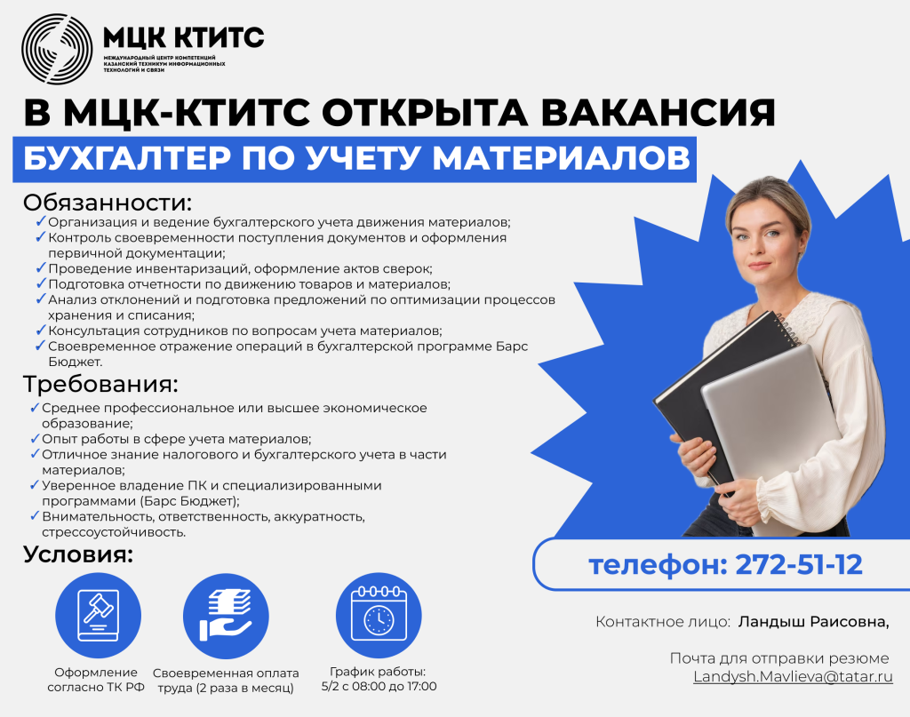 🔥 В МЦК-КТИТС открыта вакансия бухгалтера по учету материалов.