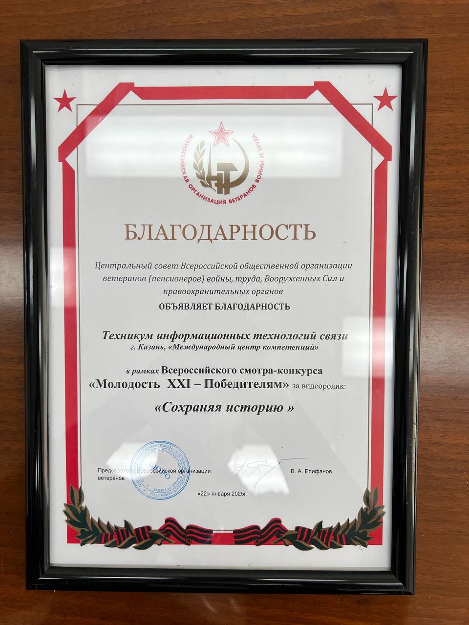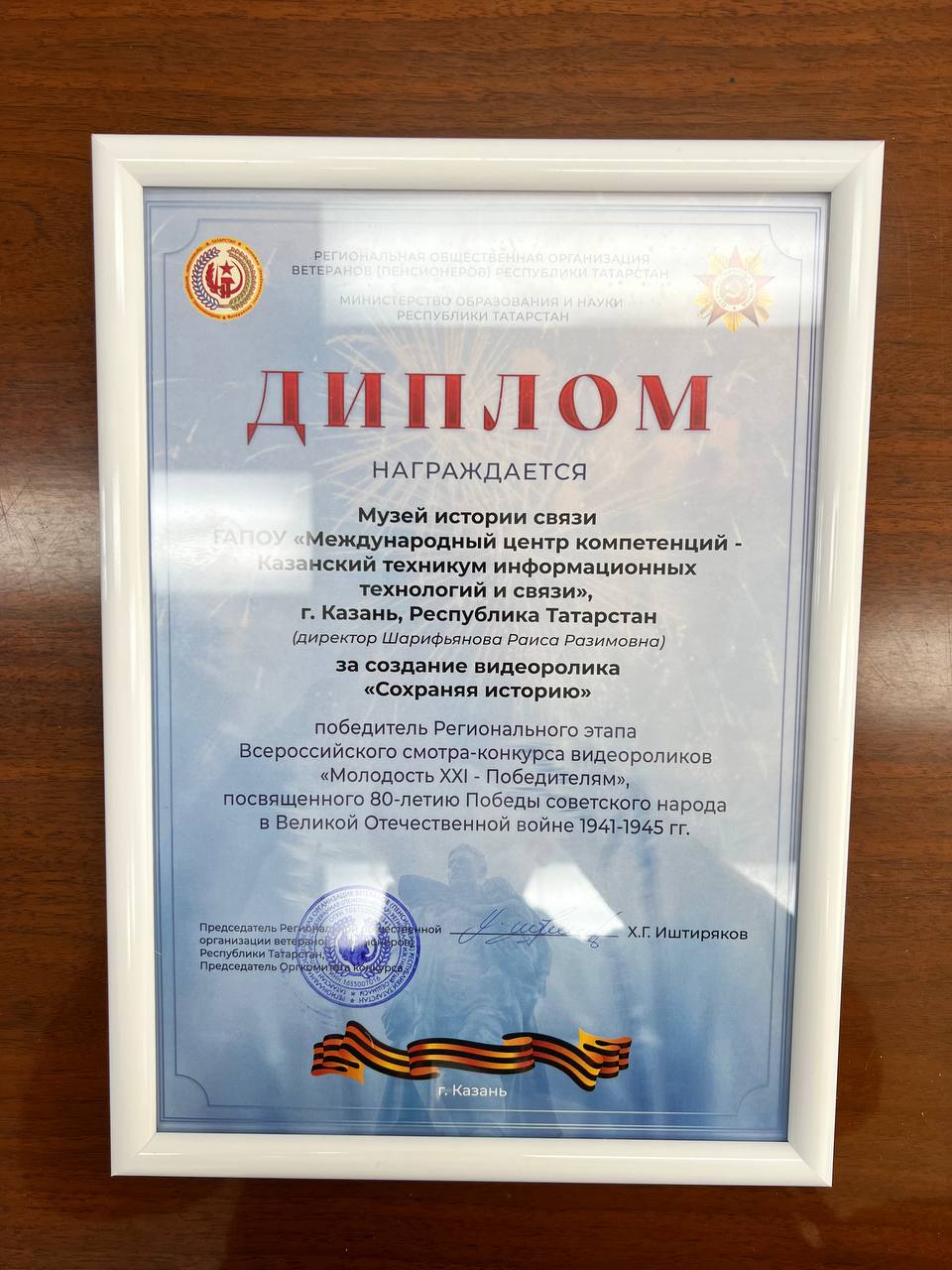 📹 Видеоролик «Сохраняя историю», созданный директором музея Шарифьяновой Раисой Разимовной и студентами, был отмечен высокой оценкой жюри и удостоен Благодарности Центрального совета Всероссийской общественной организации ветеранов войны, труда, Вооруженных Сил и правоохранительных органов.