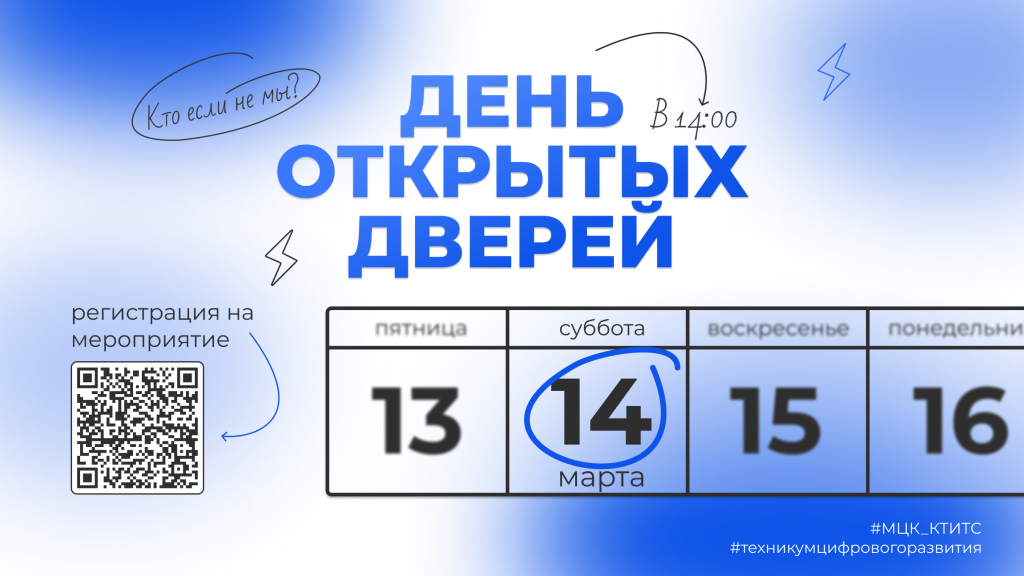 Государственное автономное профессиональное образовательное учреждение «Международный центр компетенций — Казанский техникум информационных технологий и связи» приглашает Вас на День открытых дверей, который состоится 14 марта в 14:00 по адресу: г. Казань, ул. Бари Галеева, д. 3а.